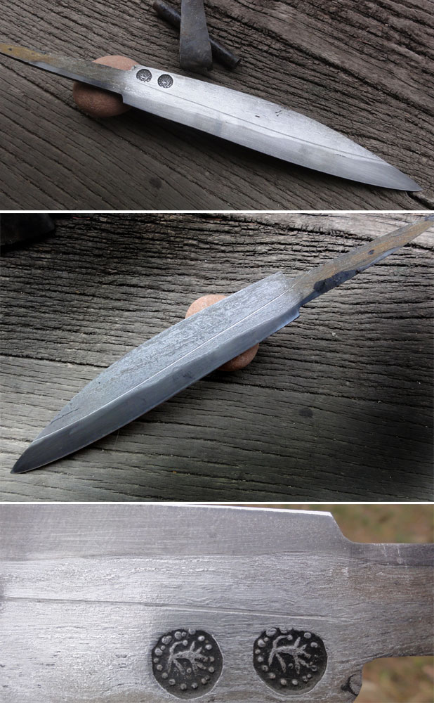 its wrought iron backed seax blade with hand scraped gooves and stamped with early saxon coin designs- i took the inspiration from a blade from Thames
