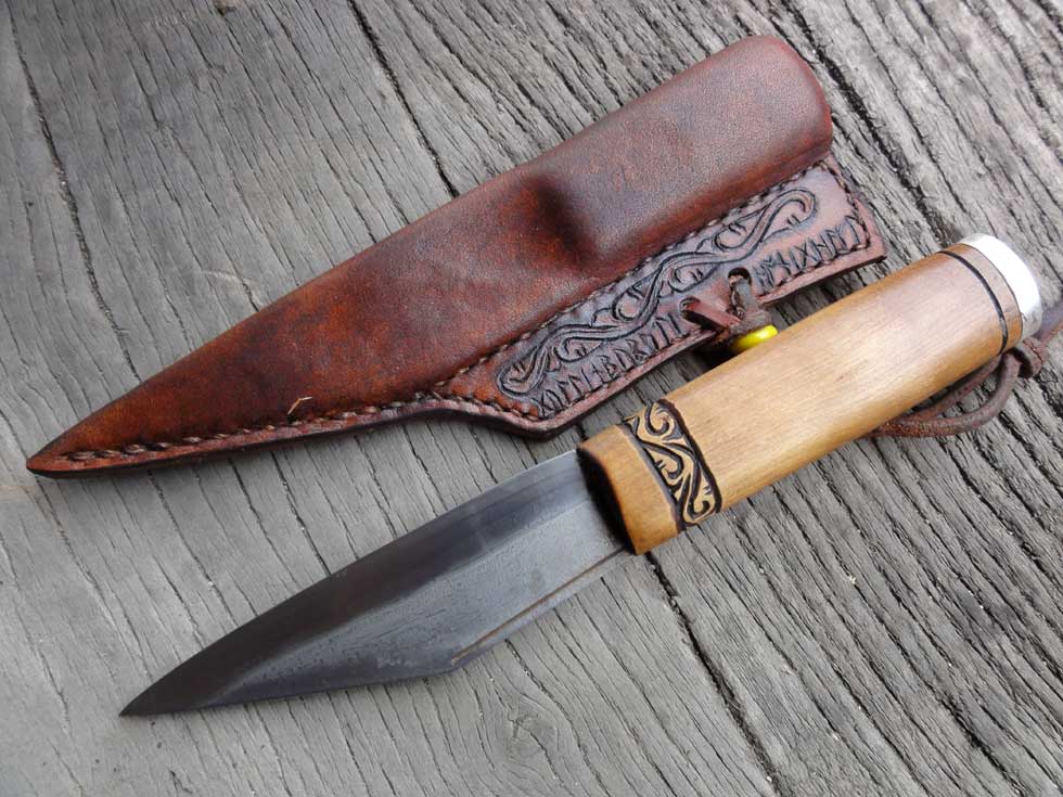 I notice that when sheathed this example has the edge of the blade pointed downward. Many reproductions- especially in the broken-back blade shape- have the edge of the seax oriented up when sheathed.