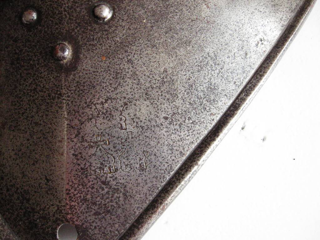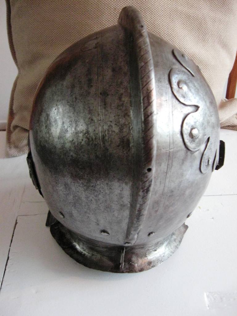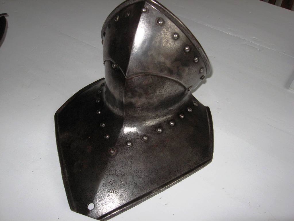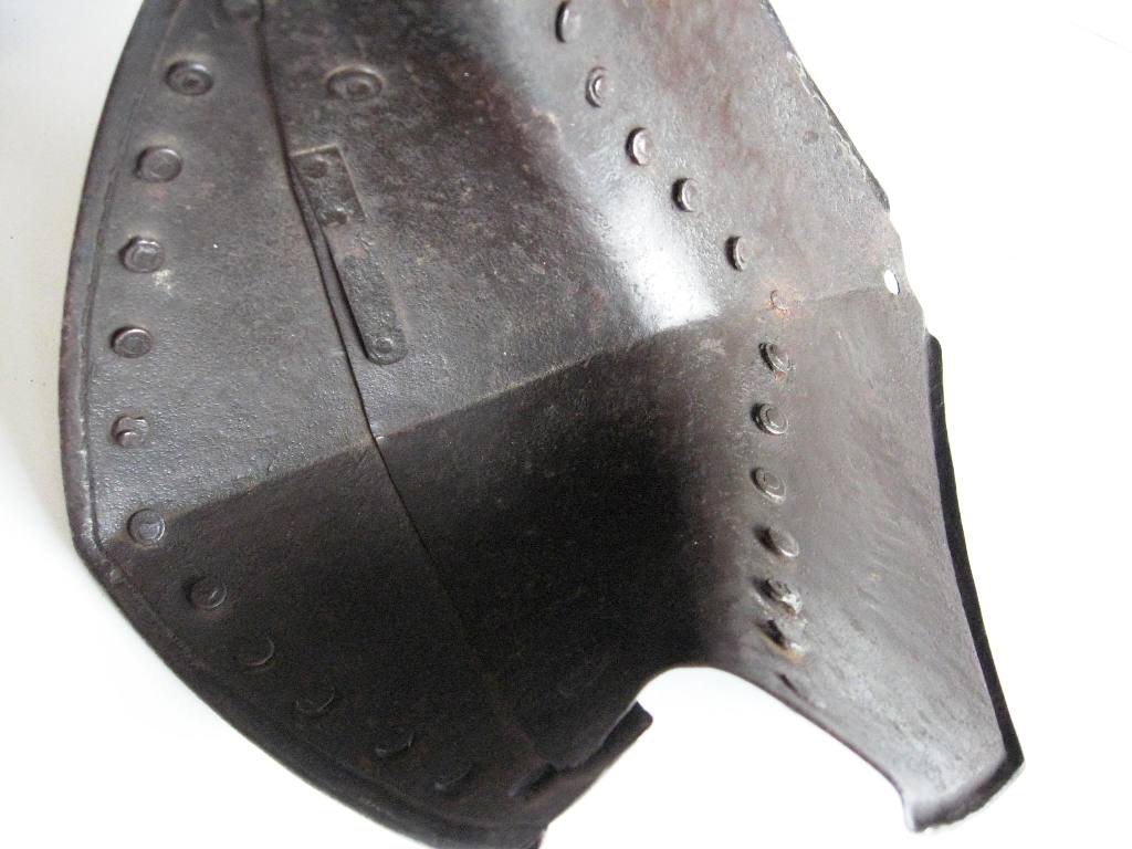 The burgonet is a real mysterie to me so maybe there is someone who can tell me who's right. My humble opinion tells me that is authentic, but maybe started his life as a different kind of helmet. Sure is that it was repaired with a patch and underwent some rough modification in the form of a nosegard. It also bear's the initial of someone. The kull is made out of two pieces.