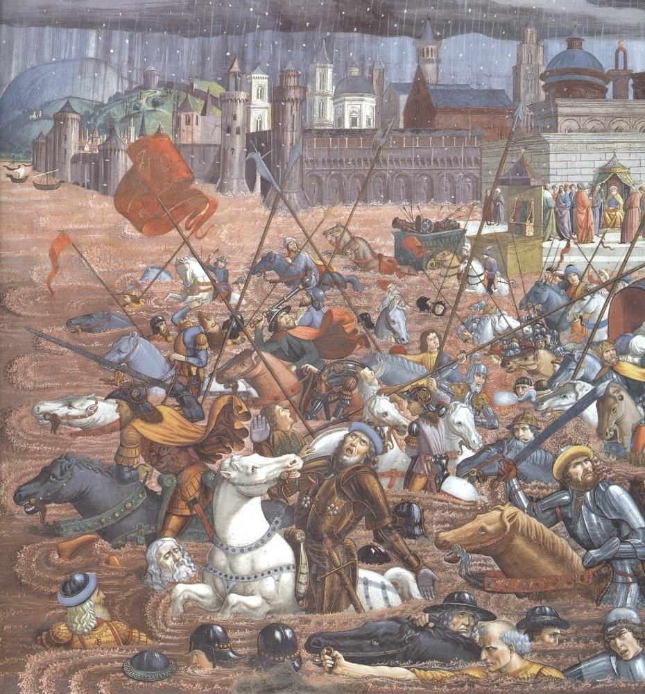 The first is a scene of the Red Sea crossing, depicted by B. D'Antonio (Or C. Rossellini or D. Ghirlandaio) on the south wall of the Sistine Chapel in Rome (1481-2): there are some good examples of contemporaneous arms and armour.