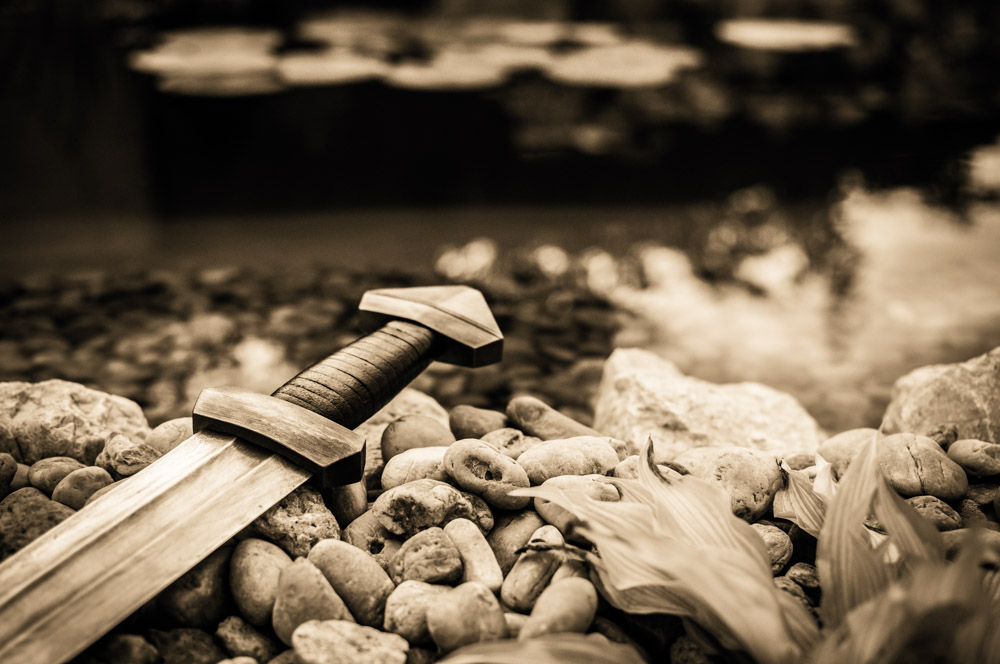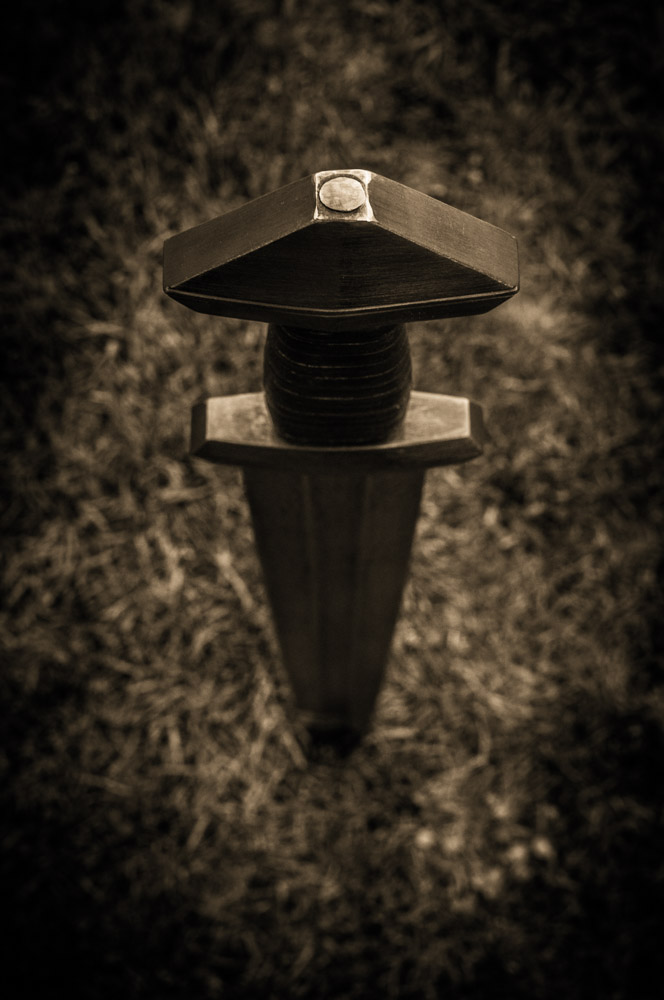I had it made by a local smith. I asked for a rough finish, so that you can see some pattern in the blade. The guard and pommel are blackened. The grip is wood, thread and leather. The edges were heat treated differently, the pattern is still visible on the blade, similar to katanas.