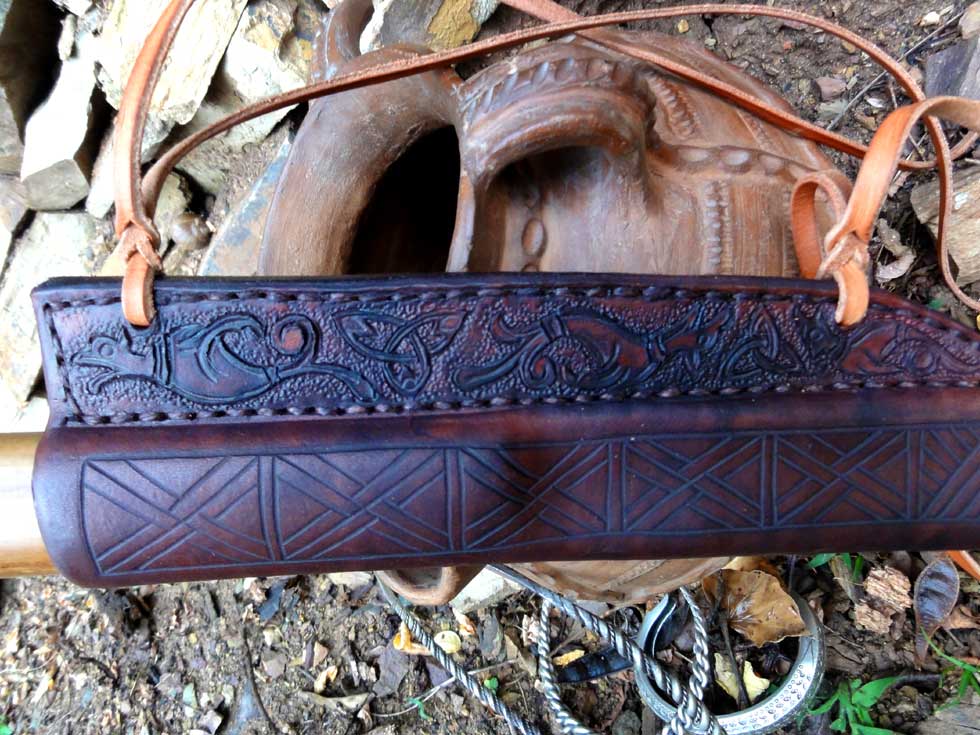 the handle is antler, boxwood and silver, leather sheath, all carved or tooled in Trewhiddle style