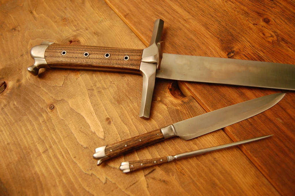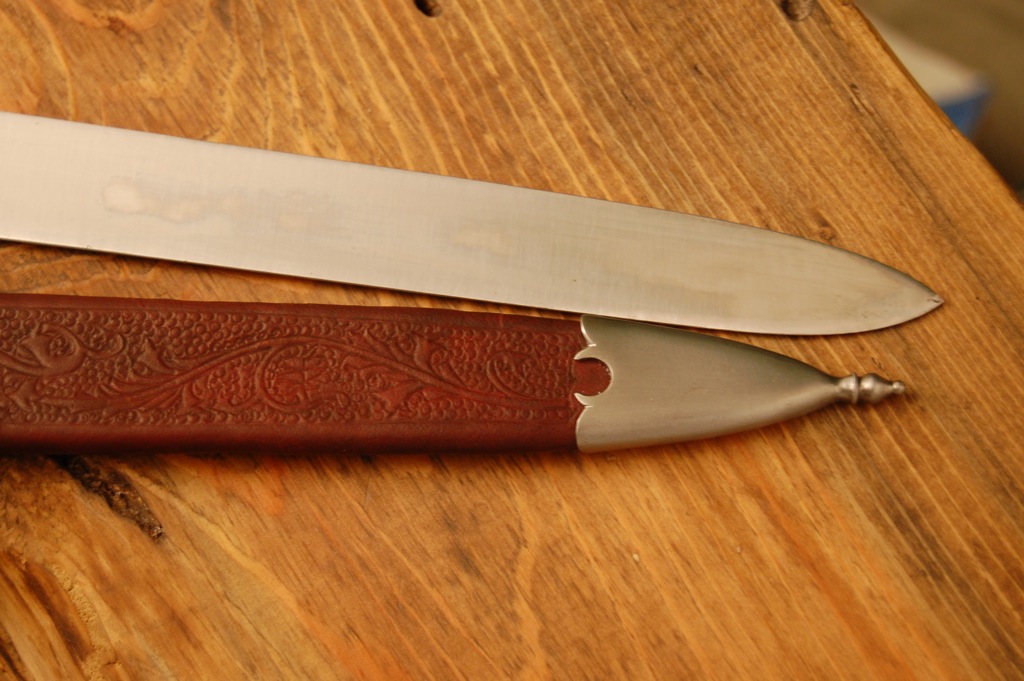 The messer is based on an example I stumbled upon in an auction house in Augsburg, Germany...however sadly it was not for sale and only a display piece. The by-knife and pick are made to match the messer but were not included in the display. The messer is hollow-ground and 24 1/4 inches long with the balance point around 2 inches, and the scabbard is constructed of two layers of leather. The technique used on the scabbard was an experiment in a more medieval approach of tooling leather. The technique I used was simply a warm sharply beveled dull knife on damp leather with a simple circle punch used for the back ground. I did not use any hammers in the detailing and it was done with a propane torch to keep the heat to the point just before the water would sizzle. Also the tooling of the scabbard was done post construction in trying to keep with the medieval process. I will post some pictures of the tools when I get back to the workshop but here it is...