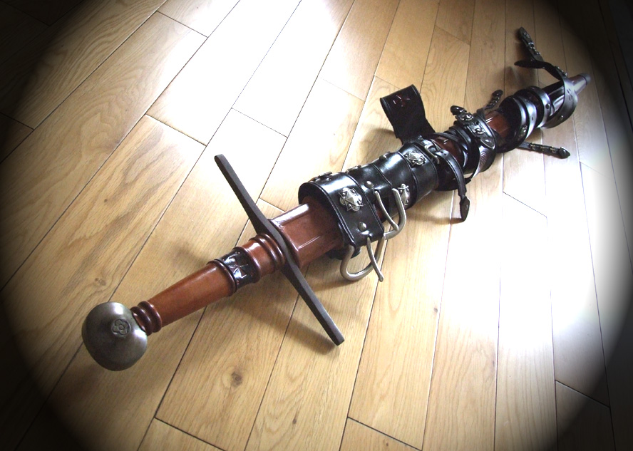 I am offering a custom vintage Windlass Crusader sword for sale. This is an older Windlass sword, is a copy of a Del Tin sword. it is better quality than todays Windlass swords. Highly customized with high quality materials, veg. tanned cowhide leather, hand cut and hand tooled. Comes with a custom scabbard, wood core wrapped with cowhide leather, with an antiqued 2 tone finish. The belts were hand cut from US veg. tanned cowhide, decorated with solid antiqued fittings. This was quite an intricate and time consuming project, the sword is a one of a kind. The blade has been sharpened and treated to an antiqued anti-corrosion finish, but it can be polished back up if anyone wants to do so. The entire sword has an antiqued finish/look to it. This is a pretty large sword, this rig was designed for a larger individual with some room for adjustment.
