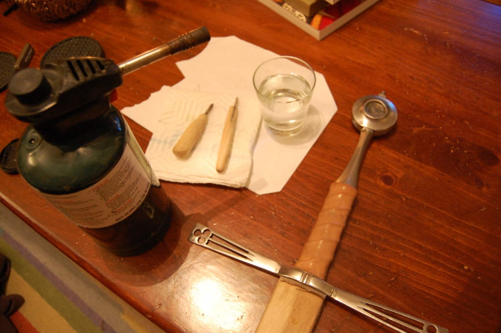 After that I figured why not finish the grip for a sword (with process pics to show) that I have been on the fence about for ages…so I finally decided to do a sort of mix-match grip. I chose the tooled grip from the Durer style sword in Paris and the half steel grip from many different pictures that I have stumbled across. The guard is a one of a kind and the pommel is not quite finished yet…I have some other fun ideas I would like to try with it and will be sure to post pics when I am finally done with the sword.