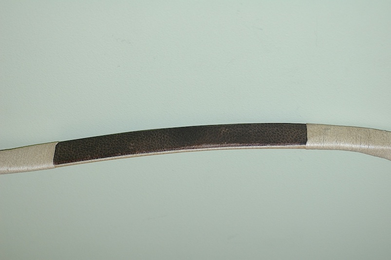 Length strung, 52 inches. Maximum draw, 32 inches. Leather covering in light tan and brown.