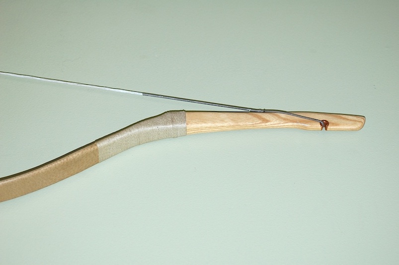 To avoid twisting it, it must be strung carefully by being bent back while held between the legs, or by two people, one bending back both ends with the grip against against the shin or foot while a second person notches the string in place. One can also purchase a bow stringer.