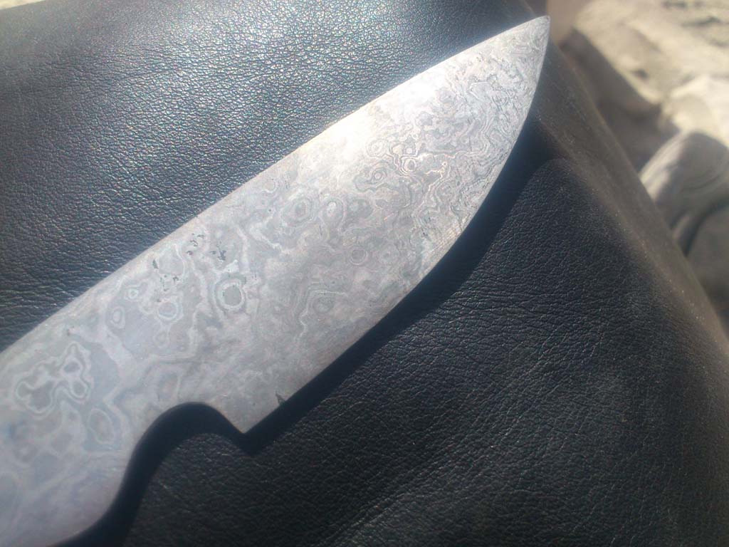 I heat treated the blade, altough I have heard that it is not completely necessary in the case of a damascus blade. For the first time, it was not quite fine, but for the second I was satisfied, and after some more work with the sandpaper the piece was ready for the acid.