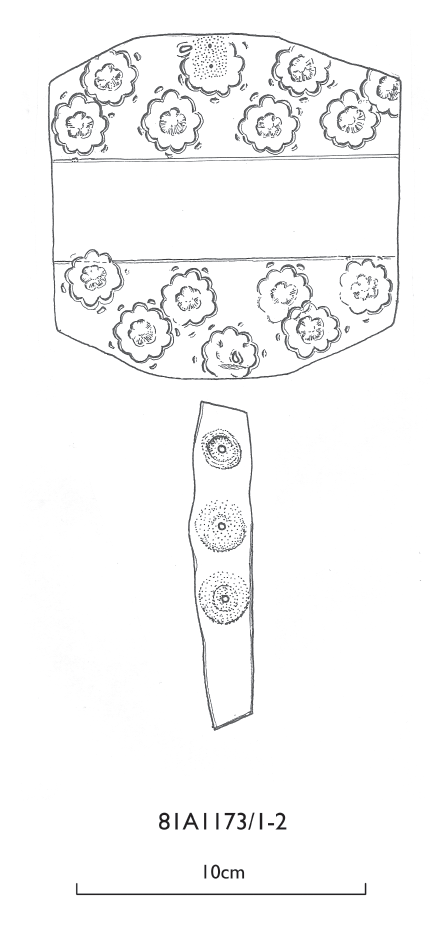 Note that on some of these there are two holes on the side of the guard opposite the attachment point of the strap or on the ends of the opposing strap. Those holes held small rivets that secured a buckle plate.