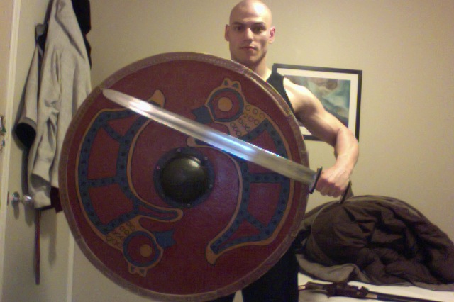 Custom Migration era behmer type 6 sword with scabbard and shield done by Jeff Helmes and wife together or separate. Picture included of myself holding the items. Jeff made the sword and shield. His wife painted the shield.