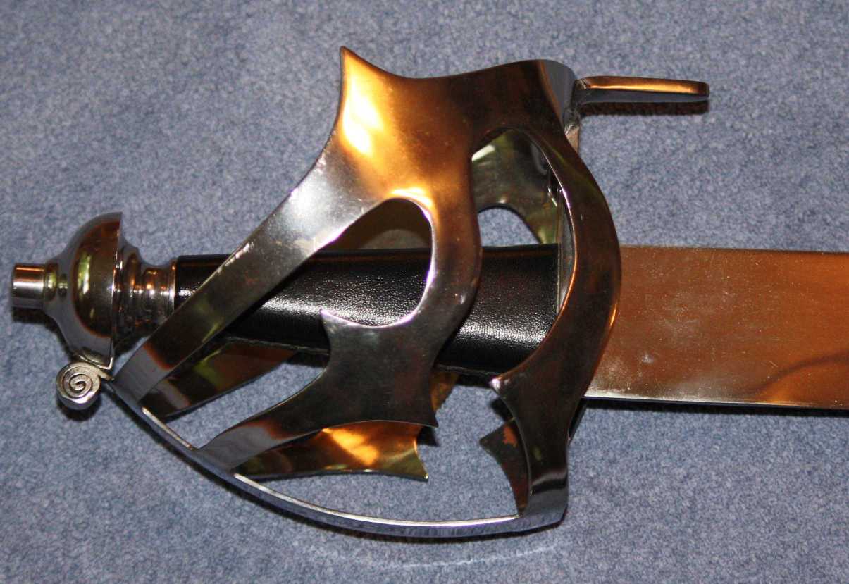 "High carbon steel blade made by Windlass Steelcrafts. Steel pommel and leather-covered wood handle. Includes leather scabbard. Overall-28 1/2". Blade-22 1/2" long, 2" wide. Wt.-2 lbs. 10 oz"