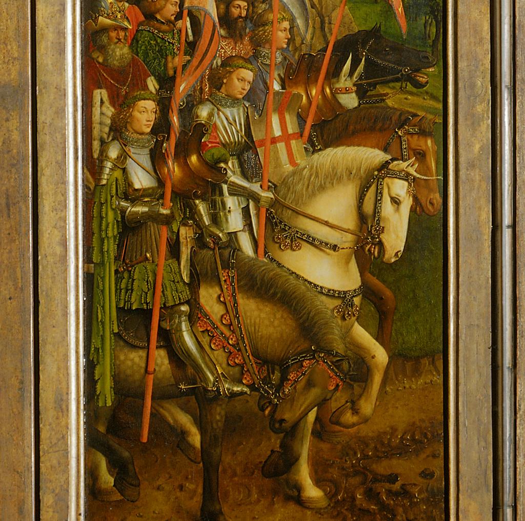 The problem I have is when I look closely at the breast plate. The color shift on the figures side suggests that the breast plate only covers the front and part of the sides of the torso. But what about the rings that encircle the arms? They look like a sort of trim work, like brass work on gauntlets except that they extend all the way around the arms. The buckles in the center of the back also leave me with questions.