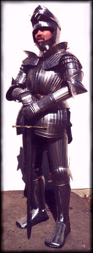 The model in the photo seems somewhat unfomfortable, and due to this and despite many of Deepeeka's claims, I do not believe this armor to be specifically for functional/costume uses. The man also lacks a padded gambeson....or anything for that matter. Knights would wear hosen or chausses, a tunic, a gambeson, and light boots underneath their armor, and the man does not seem to be wearing anything at all. Perhaps this is done to suggest that a gambeson/clothing is not included, but the effect is not very good. Other than that, I do not see too many other problems with the armor from a spectator's view point. His armament however, is a different story. It is difficult to discern, but it appears he is holding a sword of early Celtic descent. It is possibly a baselard, which would also be somewhat out of place in armor (the Maximilian's landsknechts were bitter rivals of the baselard wielding Swiss mercenaries), but it seems more 'primitive' and looks like a celtic "man-hilted" sword. Finally, his shield is of an earlier period and had fallen out of general usage by the early 1500's or so that this armor originated in.