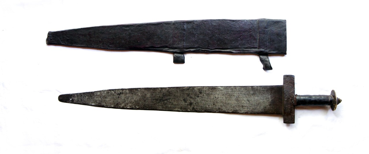 The pommel is a heavy brass construction and balances the blade well. The grip is leather wrapped and simple. The scabbard continues that theme being all leather.