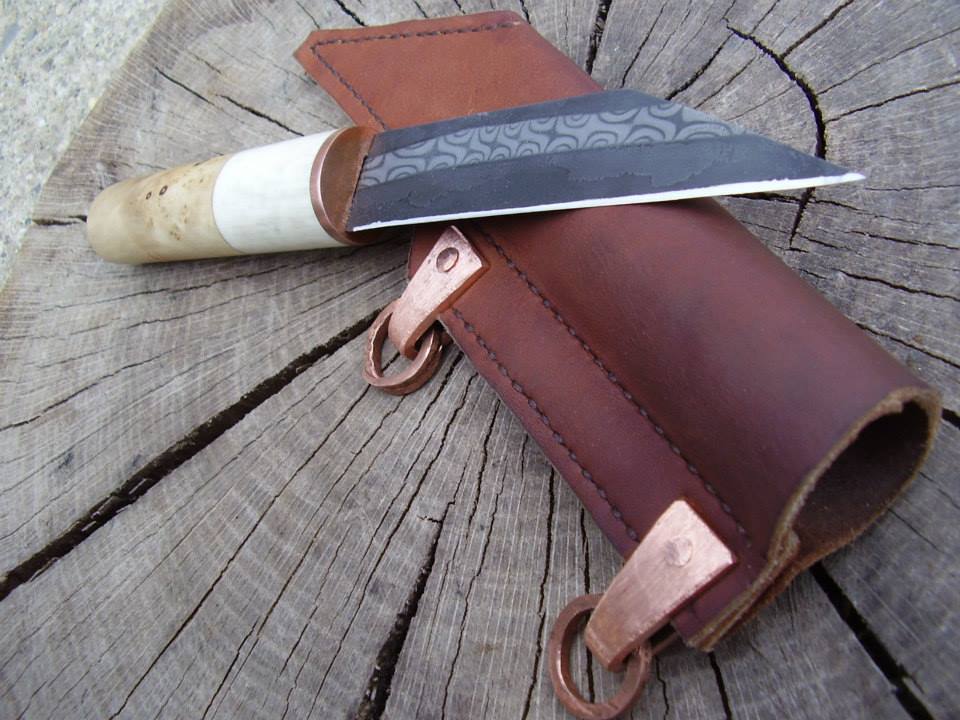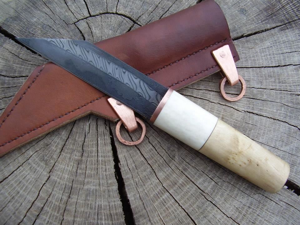 I just finished this seax knife with broken back and a damascen steel stripe, back and blade are made of 50yrs old fair file. Guard is made of copper, handle is burl beech and deer horn. See also attachments below.