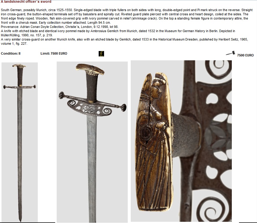 Does anybody know anything more about this wonderful landsknecht sword/messer? It has been auctioned some time back on Herman Historica, and a similar piece (with more sword-like handle and pommel) is in Vienna (Kunsthistorisches Museum).