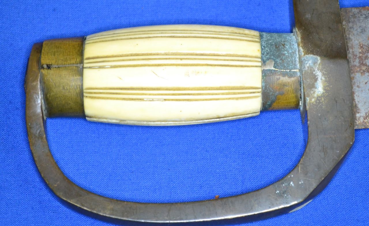 The cutlass is in sound, tight condition with some corrosion to the blade. Substantial plain blade with no fuller. Ivory handle with brass or bronze knuckle bow and single quillon. Leather scabbard with a rolled cloth binding and suspension.