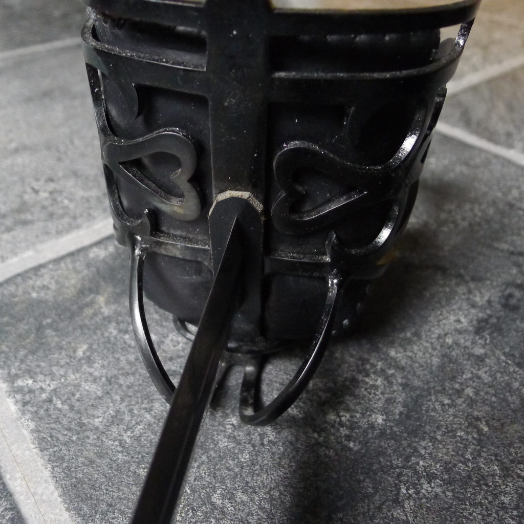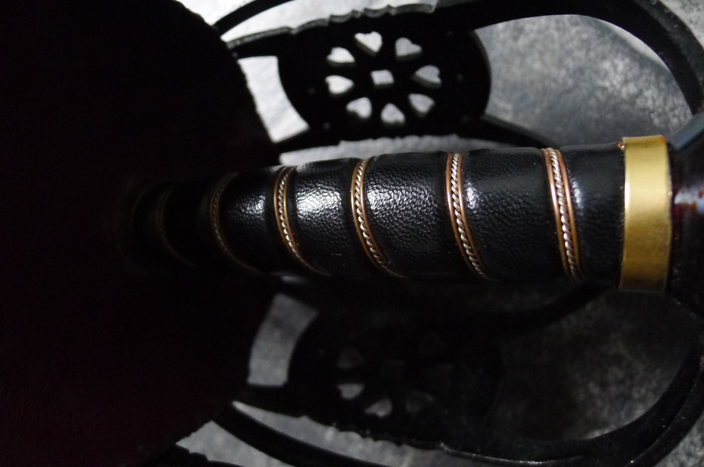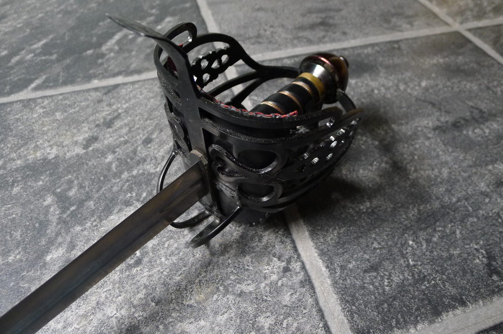 This sword is based on the Highland military pattern, and chas a leather grip. The steel basket is heavily pierced with heart and diamond motifs. The 31” double edged blade is fullered to give an overall light and fast sword.