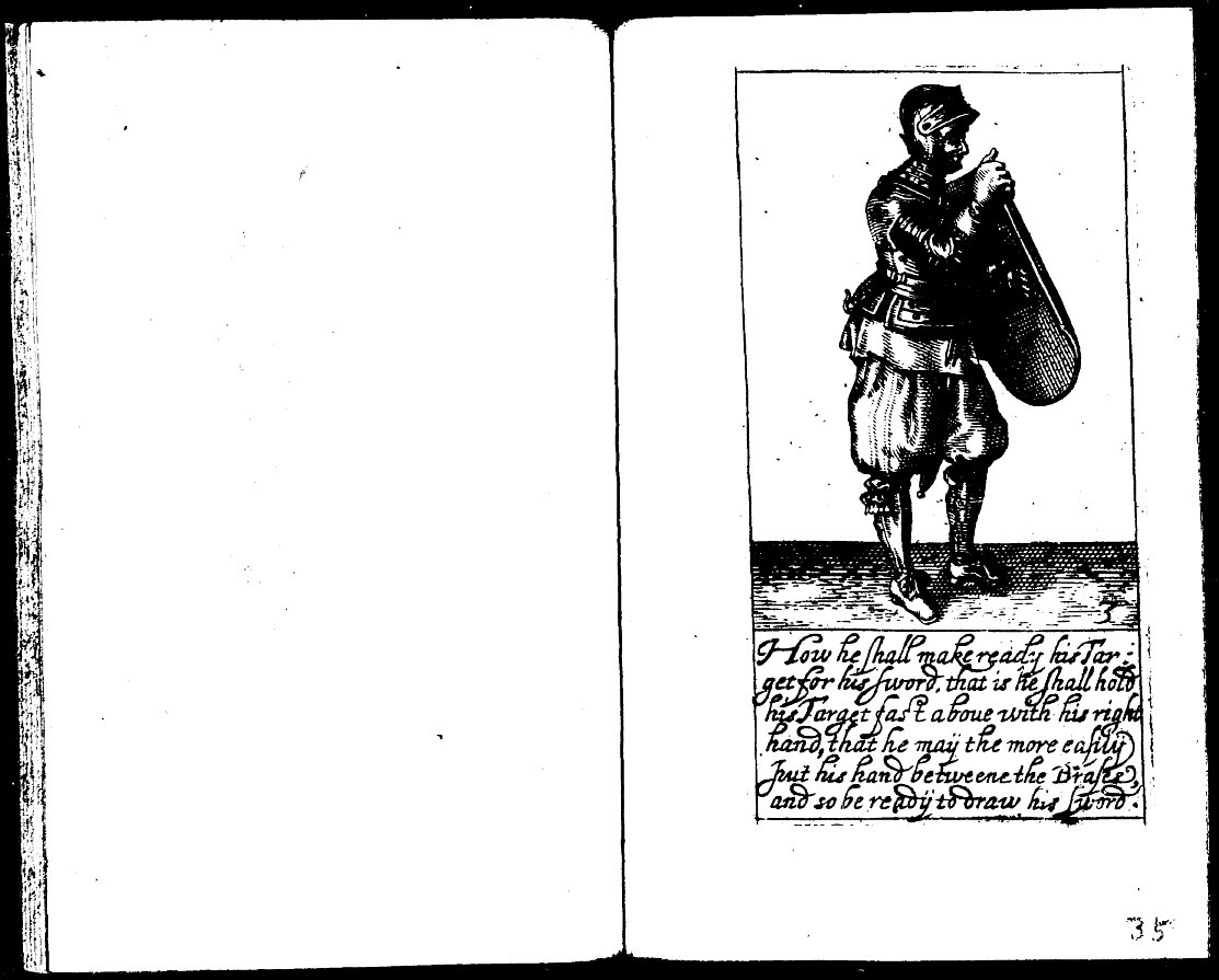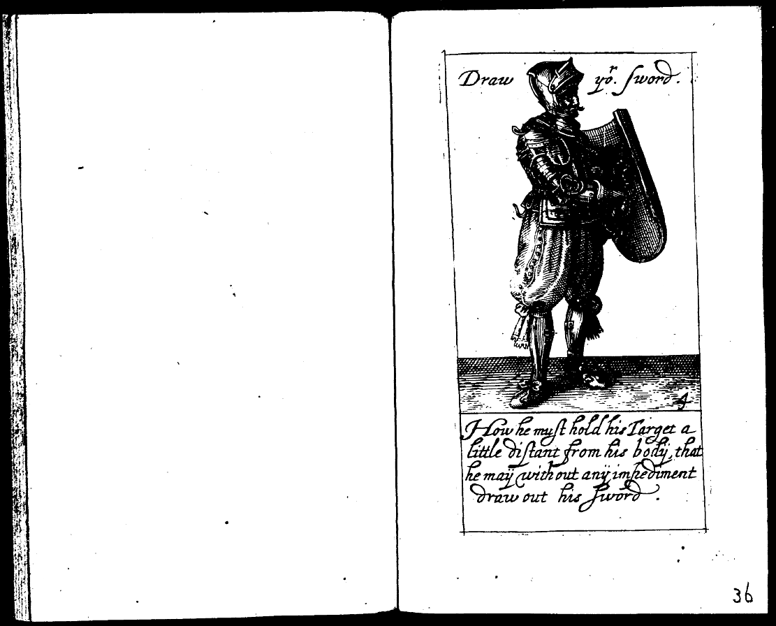 (You can draw a longer sword worn on the left side under a large shield, but it requires different movements. See the attached images from an early seventeenth-century shield drill manual.)