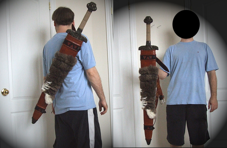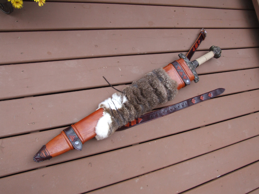 I have for sale a custom, hand crafted scabbard for the Conan Atlantean/Destroyer sword. The scabbard was hand made in Canada, it has a wood core, is wrapped with natural 3 oz. cowhide leather, finished in light brown color, and wrapped with natural, xlarge, long hair, real rabbit fur. The leather is stitched on the back with natural hemp cord. The scabbard has attached, adjustable , hand cut belts, from natural veg. tanned cowhide leather. The belts were hand stamped and tooled and are finished in a dark brown / mahogany color. Fully adjustable to accomodate most sizes, from big to small, with xtra room to punch additional holes if need be.