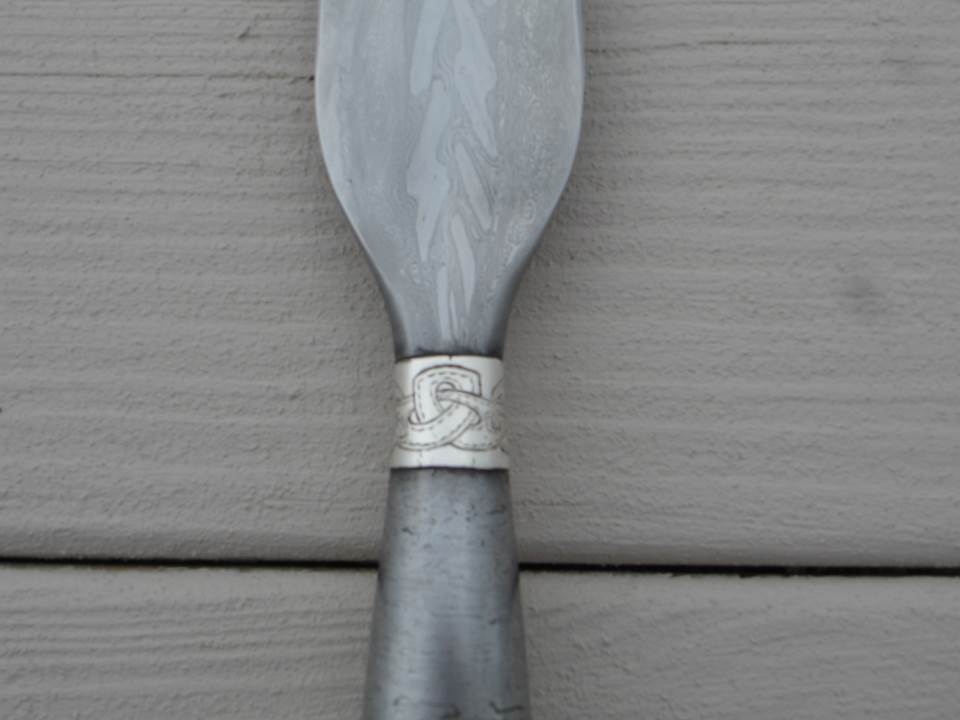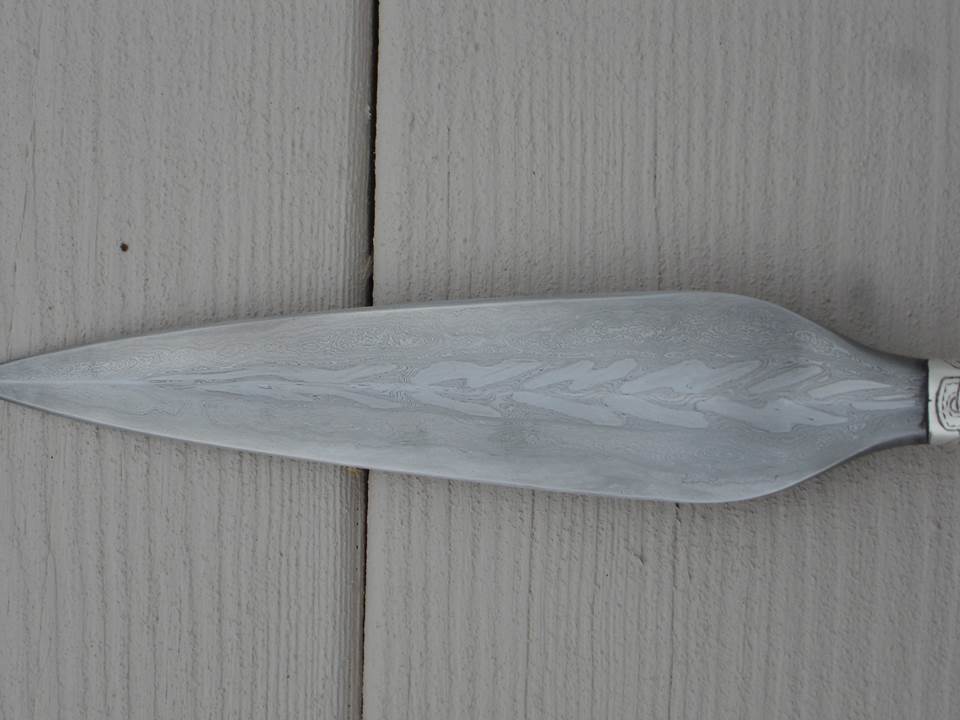 For Sale: Jeff Helms PW Viking spear head. Silver collar with knotwork pattern. Purchased this from Jeff in June, decided to hold out for a longer Frankish spear for wings, but this is a beautiful pattern weld. No cracks, gorgeous pattern. Forge scale on one side. Sharp and beautiful. Looking for $500 OBO. Any questions or requests for pictures, let me know.