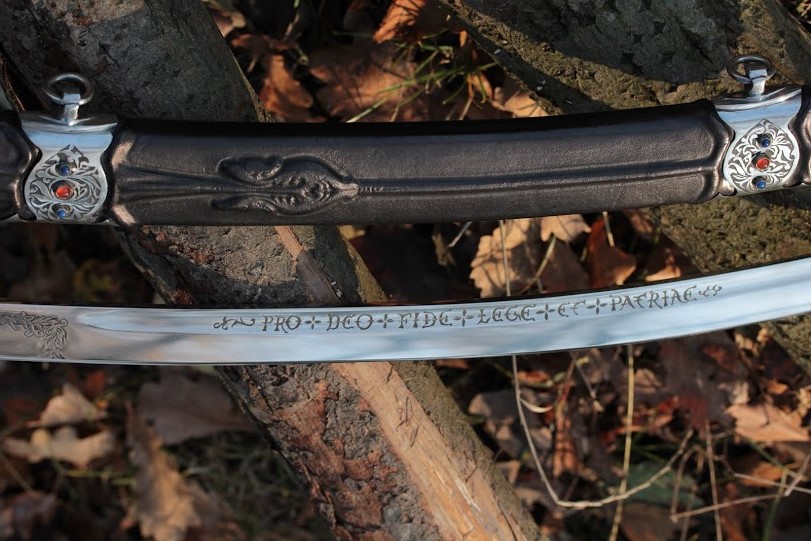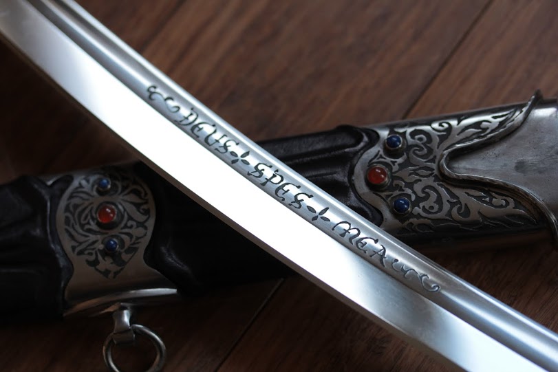 Single fuller with etching sentence "Deus Spes Mea" on one side and "Pro Deo Fide Lege Et Patriae" on another.