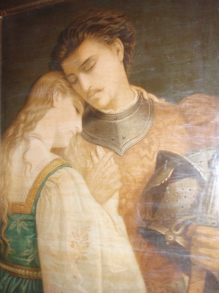 Thanks for your comments. Paint may look recent because of the angle/flash on that first pic. Here's a couple more pics, last one being a detail of the young woman's clothing. They look to be of noble origin, and I am under the impression that this is the goodbye before going to battle. Mart's post resembles the helmet very closely. At first I was under the impression that the front portion of the helmet, the part that protects the face, could be lifted up but now it seems to me as being all one fixed piece.