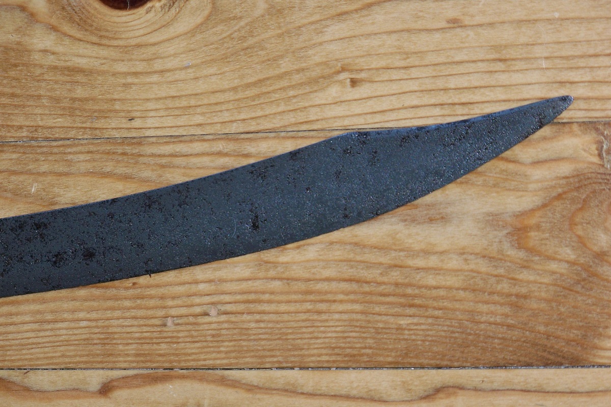The blade narrows in width from the ricasso and swells towards the clipped point. The back edge of the point is bevelled/sharpened.