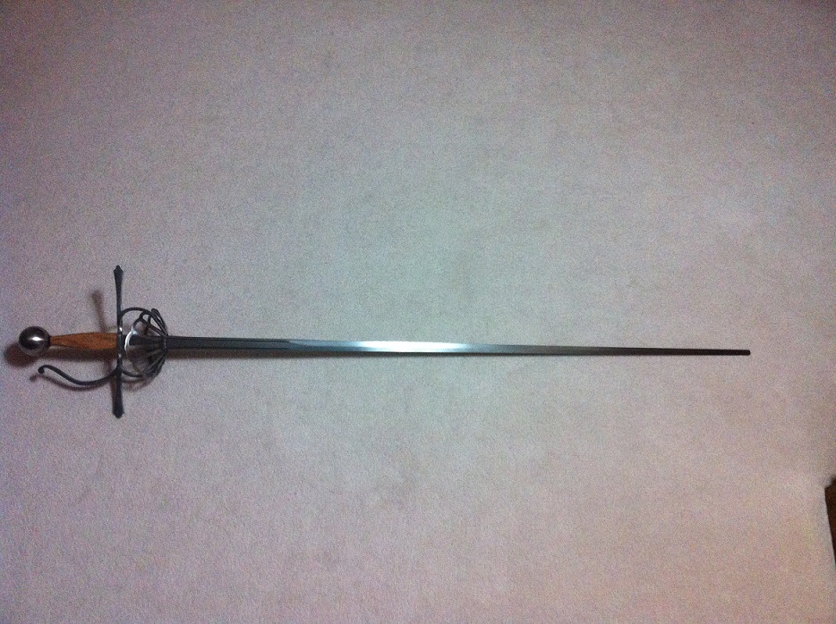 Looking to sell my brand new Castille Armory tempered steel clamshell hilt rapier with 42" double fuller diamond ground crossover blade. This blade is legal for SCA rapier and C&T and my plan initially was to use it for both. This is a beautiful piece and is extremely sturdy and the blade comes with a 10 year replacement warranty for any breakage during sparring. I initially purchased it for 278.00 USD + shipping. I would like to get 265 USD + shipping just because I have handled it a little bit but its literally brand new and never sparred with, I am just going in a different direction with what I want. This is his new economy hilt that I upgraded to the crossover blade style and larger pommel to accompany the beefier blade.