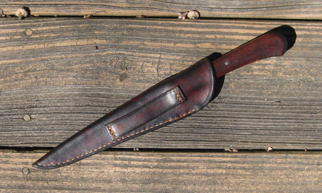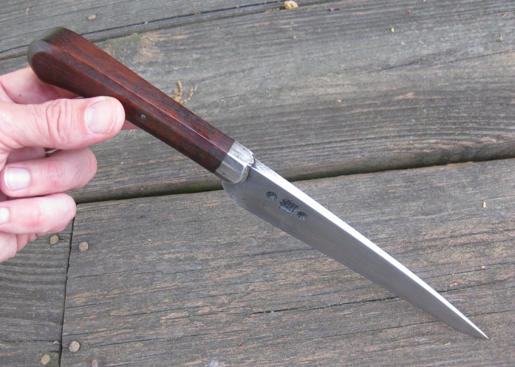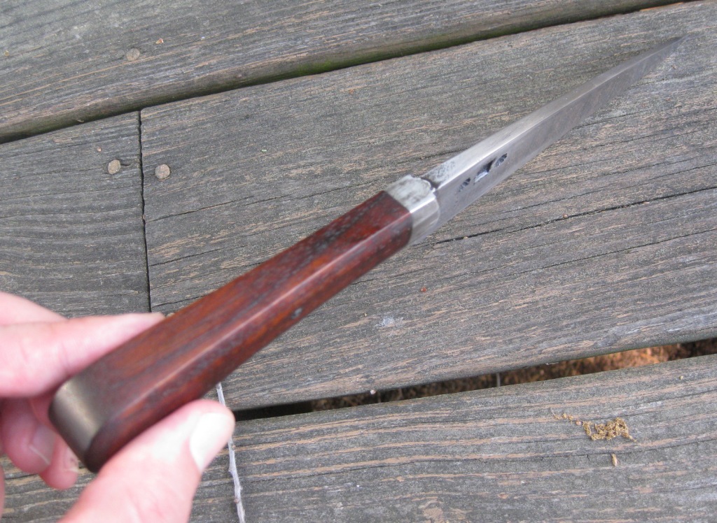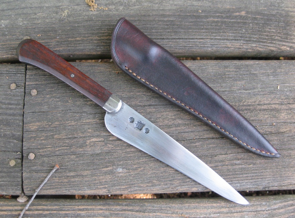 For sale is a hand forged knife by Nathan Allen. 6 1/2" blade with an overall length of 11". Faceted walnut handle with poured pewter bolster. Vegetable tanned leather sheath hand stitched with linen thread. Price is $115 -- includes shipping in the continental US.