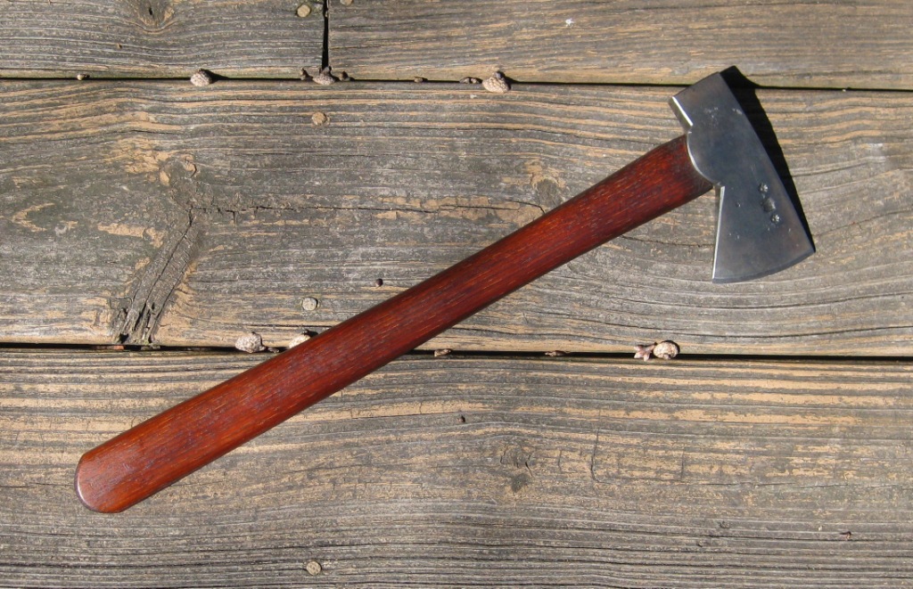 Also for sale a small belt axe by the same maker. Head is 4 1/4" long with a 2 1/4" cutting edge. Overall length is a hair over 15". Comes with a brain tanned leather cover. Price is $125 including shipping in the continental US.