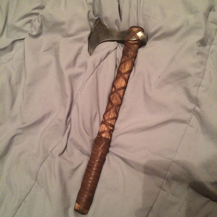I have a viking hand axe that was custom made by Roy Dun. It is inspired by the viking hand axe of Ragnar Lothbrok of vikings. The handle is oak, the axe head is 5160 high carbon steel and its laced with leather for comfort. It also comes with a sheath for the head. I'm asking 125 for it.- Neal Colleran
