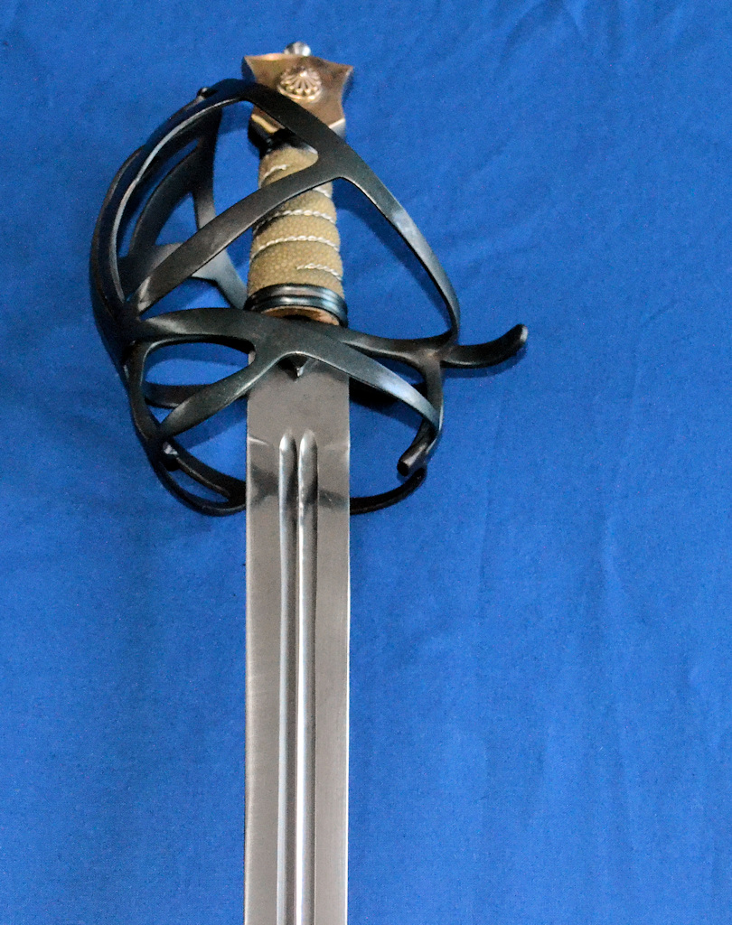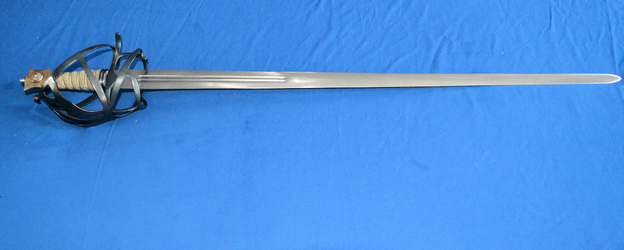 Modern reproduction of an early shiavona sword, made by Armour Class in Scotland. Blued hilt and sharkskin grip. Lenticular broadsword bladewith two short fullers. Purchased with a scabbard and rapier style baldric. 7- 8 month delivery. Iain at Armour Class always responded quickly and courteously to any of my queries.