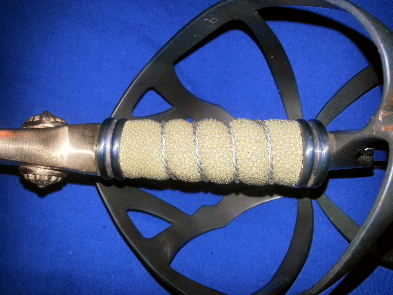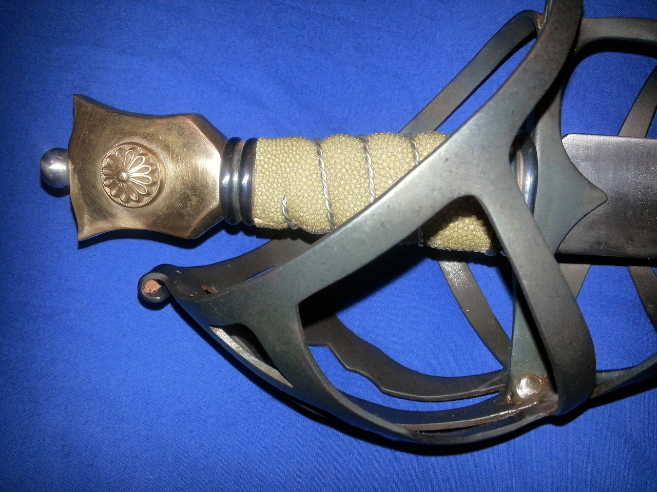 Well put together with a solid feel. The standard blued hilt is rather more matt grey than blue, but is evenly done and gives a pleasing appearance. The oval tapered grip is covered in shagreen (ray skin) bound with silvered wire, The sword is comfortable to hold and seems to suit a grip using the forefinger looped over the crossguard. The cat's head pommel is in brass with a steel peen button. The pommel has nice decorative brass rosettes applied to each face. The blade is a flexible broadsword type with twin short fullers that look to have been hammered in, not milled. Satin finish to the blade which has been sharpened with barely a trace of a secondary bevel. I don;t know if all broadsword blades are created equal but this one has a very Scottish feel to it... not surprising really :D . A fair degree of profile taper for a broadsword with very slight distal taper.
