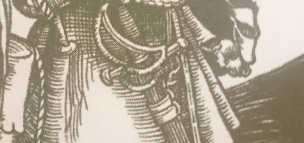 | The woodcut itself is German. The pommel is concealed by the arm of the horseman, but it might be star shaped or round. My colleagues say that it is a complex hilt katzbalger or similar german sword. |