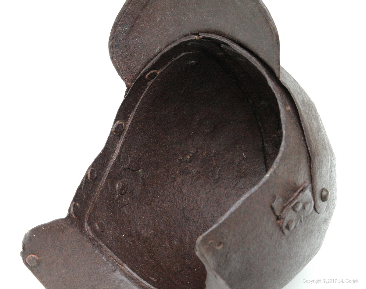That was a fairly fancy helm for its day. With the roping around the edges and the way the creases follow into the visor, I doubt that it belonged to a common soldier. Too bad the rest is missing. I like it! ....McM
