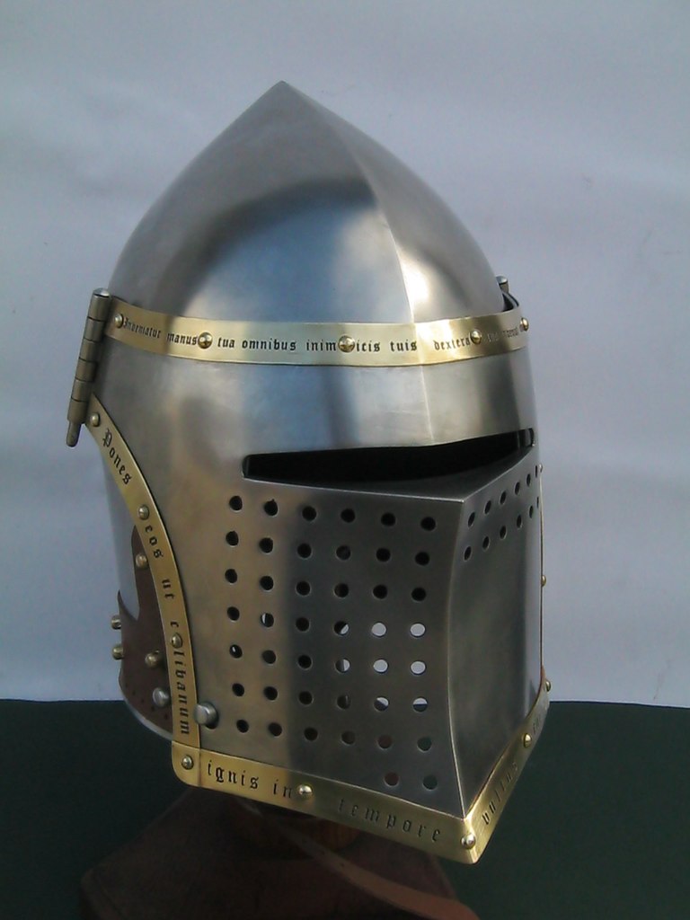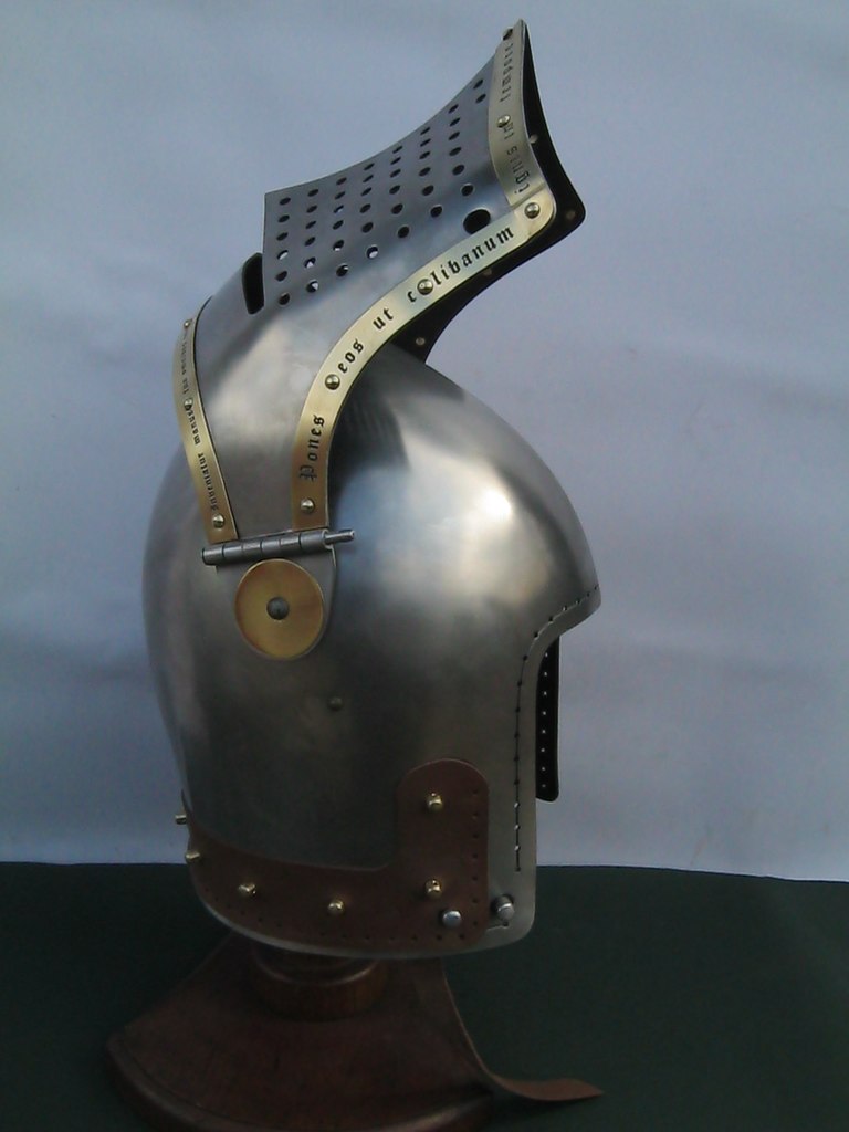 The helmet is made from 2 mm steel and fits a person with ca 60-62 head circumference with the current lining (made by Kokosz). The visor is decorated by etched brass with bible quotes and can be locked by a push button for safety reasons.