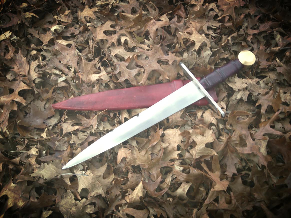 The blade is a Windlass Arkansas Toothpick blade from Atlanta Cutlery. I reprofiled the edge some and plan on adding a cutting edge soon. The cross was made from a piece of scrap angle iron and the pommel was turned by my friend from a piece of barass scrap purchased on Ebay. The grip is oak covered in goat with leather risers. I was being a bit lazy and not wanting to carve a core for the scabbard, so I pulled some scrap 12-14oz leather from my scrap pile and molded it to fit the blade and then covered with some more goat. I am not completely happy with the wide risers on the scabbard and I may go back and redo those eventually.
