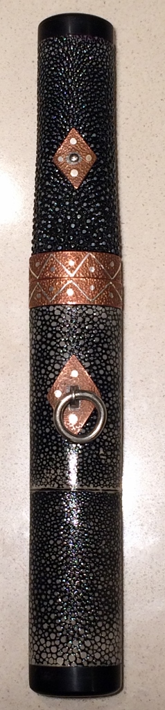 The scabbard (saya) and handle (tsuka) core are made of poplar. Both covered with ray skin (same), lacquered black, then tops sanded off for contrasting white dots (just a little on tsuka, to preserve rough grip, and practically smooth on saya), then lacquered with clear coat.
