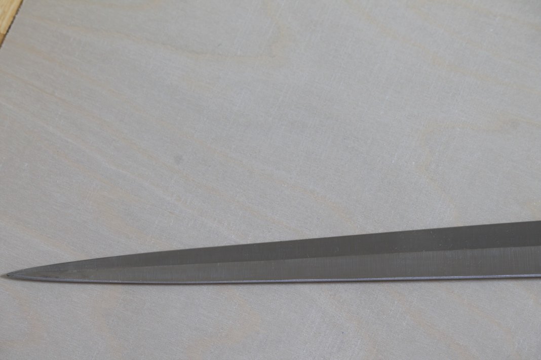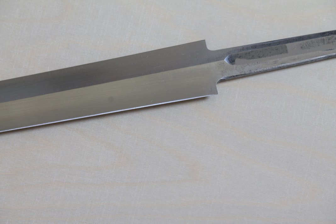 I got this blade from the recent moat sale; it was the only blade I got in "good" condition without any warping. This is the hollow ground blade used on the Regent and Earl. Had lots of surface rust when it arrived that I cleaned off with hours of hand sanding. It's been heat treated and ground to form, just needs a little more sharpening and polishing to get the last horizontal grinder marks out. Asking $430 shipped to the continental US. I accept PayPal. PM me if interested, and thanks for looking!