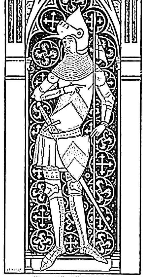| Quote: | I came across a drawing of Ralph de Stafford's efiggy and found a very curious heater shield not much bigger than a Buckler, and fastened to the sword-belt as just as one.