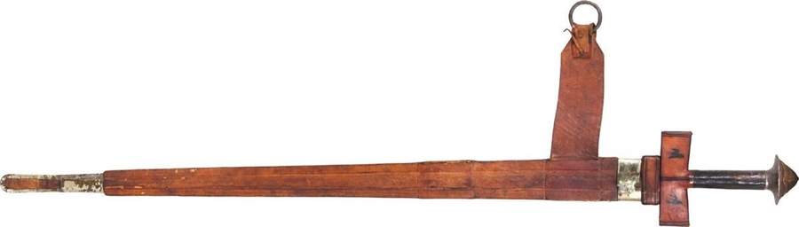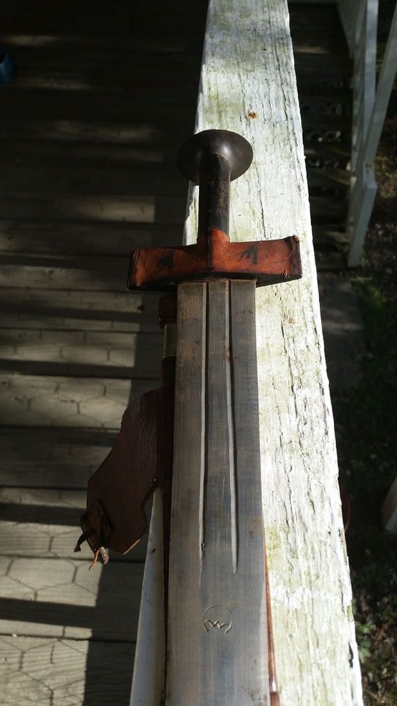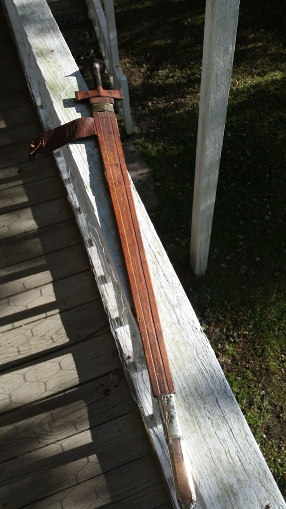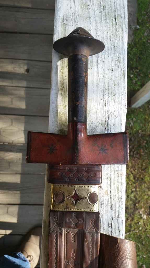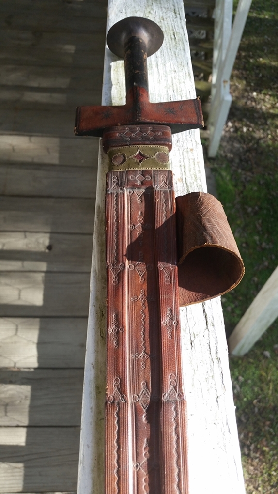 It was delivered today. I really am happy with this sword. It is lighter than I expected and the blade is is very good condition in my opinion. The POB is about six inches from the guard. The grip is tight and the leather covering the guard is in great condition. The scabbard is in good shape and the tooling is better than what I expected. I have enjoyed researching these swords and the Taureg people. I paid 285.00 with free shipping from Faganarms and I will do more business with them in the future.[/img] Attachment: 414.68 KB