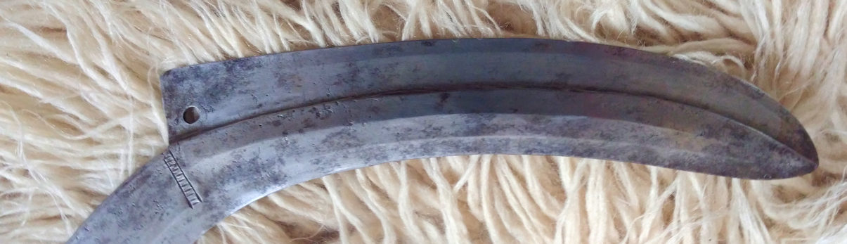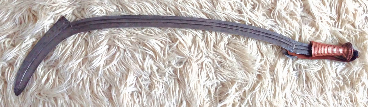 Single-edged extremely curved sword with double-edged portion to the tip. Blade is sharpened on the inner surface of the curve. Wooden handle wrapped in copper strip. Some crude line detailing near the hilt and at the point where double-edged blade begins. Decorated hole at the rear of double-edged portion. Cresent shaped protrusion near hilt which is for a strap to be attached. (new strap in place)