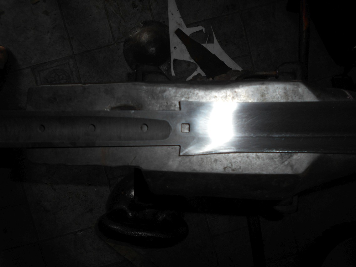 Also, thought I'd share this detail here instead of just telling Phil in private. We assemble most of our Messer models with sliding the cross down from the tip as it's a detail seen on several originals. We like it quite a bit, though it's by no means the only way. As the blade in question widens a bit towards the tip, the very base of the blade has to swell out a bit. The edge bevel curves up to the point of the base, making it the widest and thickest part of the blade, helping to lock the cross in place rather well. Normally, we'd peen the protruding points a bit to lock even more firmly, though a tight tolerance would make it somewhat redundant. This then can be filed or ground flush, or just smoothed down a bit. The shoulder area can be easily reground to accept the cross slid up along the tang, if necessary.