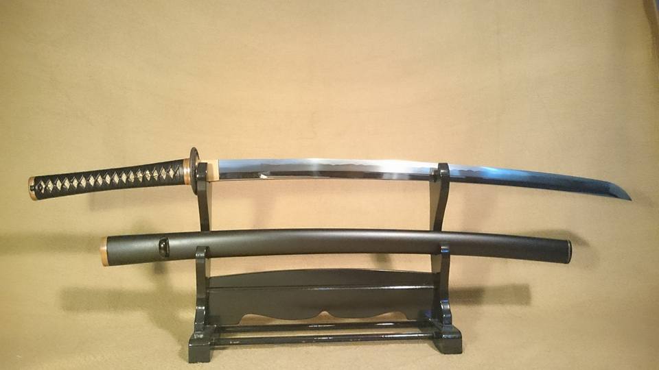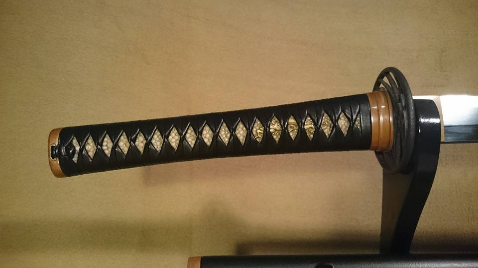 The 25,5 cm tsuka is mounted with copper F/K. It has a fulwrap Same and black leather ito.