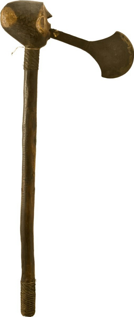 Wooden construction with a blade bearing many small circular stampings, apparently surrounded by rays. The head of the axe is figural, and depicts a face. The Axe blade protrudes from the mouth, the tang runs through the head to the other side where it is bent over. Much of its paint is gone, but there appears to be remnants of black paint on the wood. Sotheby's sold an axe very similar in appearance and listed it as Ngbaka in their 1985-86 catalogue.