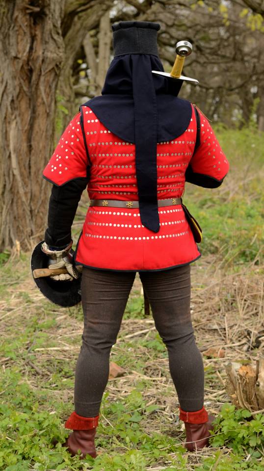 In terms of size, this armour is very adjustable. My friend who is 6’, 210 lbs with a 44” chest had no problem getting into this, but it can definitely work for someone smaller or a bit larger than that. The fellow in the images below is probably around 5’8”, 160 lbs. The overall length of the bring is aprox. 24” of plate coverage, however the fabric extends another aprox. 2” below the last row of plates.