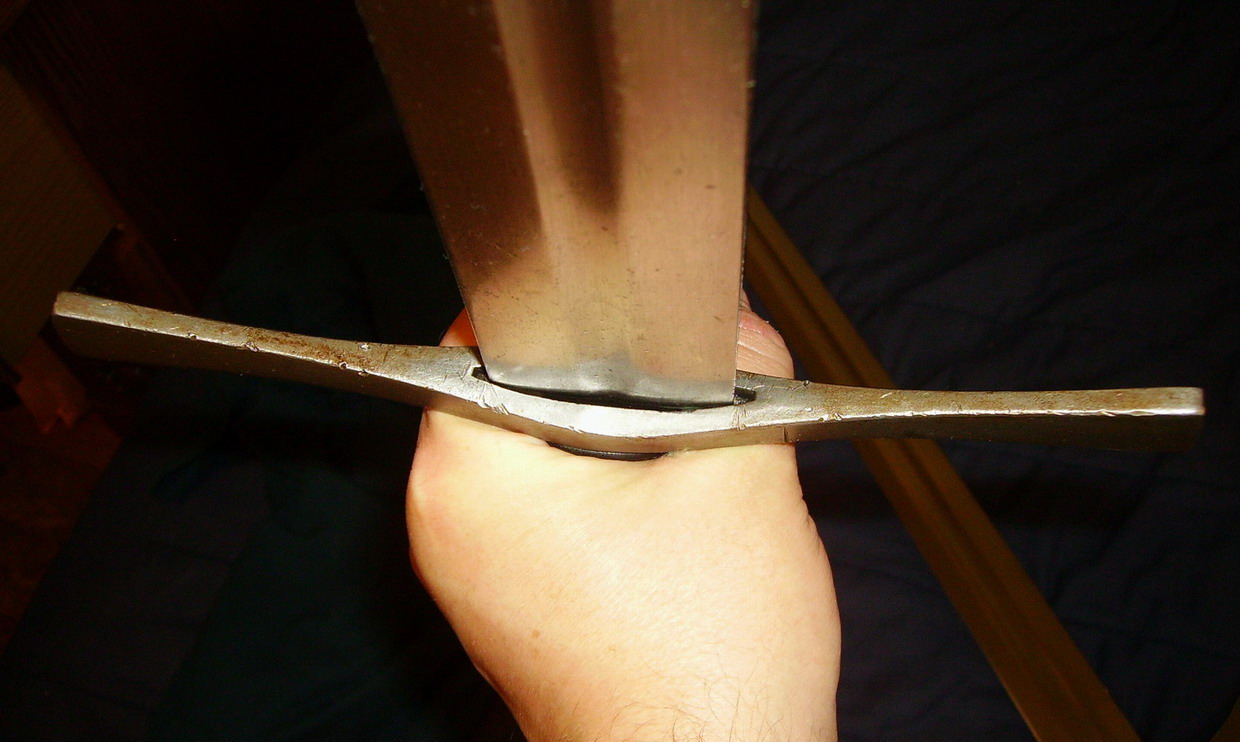 The first sword is a retired stage combat sword, and it shows it – the blade looks like a dog’s chew toy, with some pretty extensive edge damage. So why did I get it? Well, I thought I’d own the sword for a while, maybe use it as a beater, or hang it on a wall (hey, the sword has seen action and has a history – maybe not a very old history, but a history nonetheless. This makes it interesting), with the possibility of trading it off when I found a more pristine example. After repeening the tang, however (which it sorely needed, as it was pretty loose), I was rewarded with a sword that felt lighter than my dry food scale said it was – don’t get me wrong, it’s no lightweight by any means, but despite the weight, it feels good in my hand and practically begs me to dance – for old time’s sake, I suppose. The blade feels well-balanced and exhibits a moderate amount of distal taper. Despite the fact that she (yes, I called it a ‘she’) is old, ragged, and has a few miles on her, she still feels nimble and ready for action (please don’t read too much into that). She may be out to pasture, but I’m glad it’s my pasture.