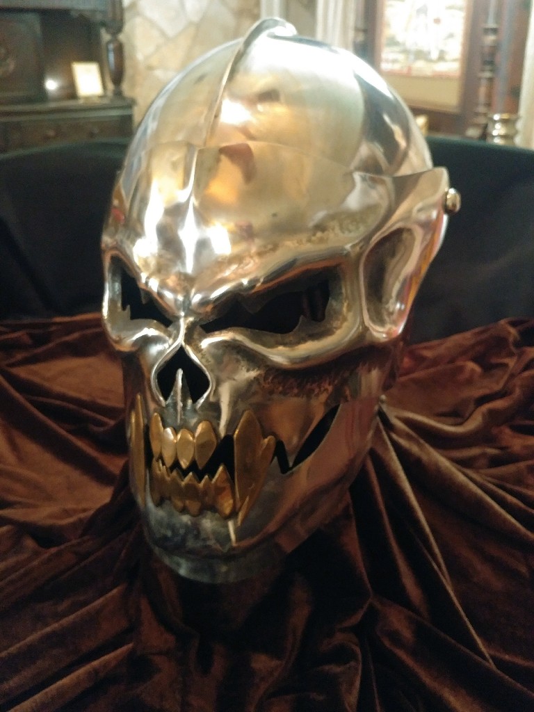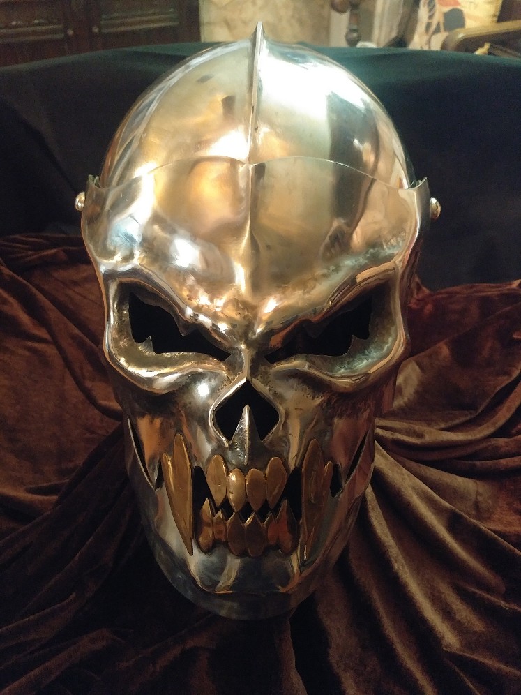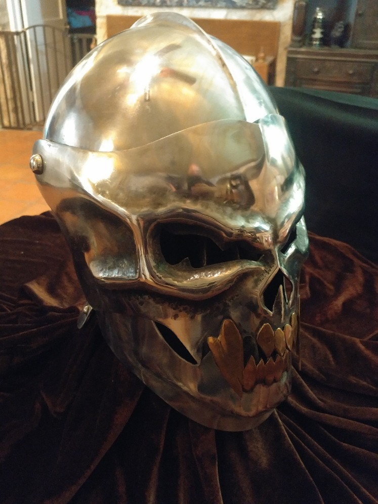 Had this made for me several years back by DK Wickstrom of Darkheart Armoury. My noggin is 23 inches in circumference and my neck is 17. Hand forged steel construction is a stout 14 gauge thickness. Visor and lower chin guard raise independently. It's not padded and it's only been displayed in my armor room. Asking price is $950 which includes shipment. CONUS only, please. I accept paypal (my price has the 3% fee figured in). Thanks for looking.