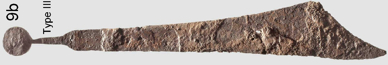 On that surviving falchion/cleaver, which is not in too bad of a condition, there is no crossguard left, but where it should be, there is a tiny hole, clearly for a pin or rivet. It strikes me as quite peculiar: I am not aware of any crossguard secured by such a pin, but it's a kind of technical detail I might simply be ignorant of for not having a deep enough knowledge.
